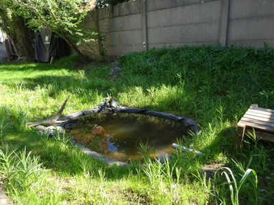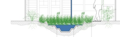 Les eaux provenant des toitures de la maison et de l’abri de jardin sont envoyées dans l’aménagement. Il s’agit d’une mare entourée de deux zones concentriques infiltrant les eaux. Ces zones sont placées à différents niveaux et sont semées d’une grande variété d’essences de plantes adaptées aux conditions d’ombrage et d’humidité. Si la mare déborde, elle remplira successivement les deux niveaux où l’eau s’infiltrera petit à petit. Dans l’ensemble, les niveaux plantés de l’aménagement seront toujours plus humides que le reste du jardin en été. Il y aura donc ici 4 milieux différents: la mare, la zone humide, la zone moins humide mais toujours verte en été, et le chouette jardin de Sébastien.